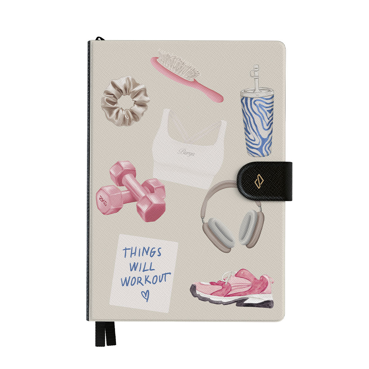 This design features: dumbbells, headphones, tumbler, hairbrush, pink trainers, sports bra, crunchie, "Things Will Work Out" sticky note