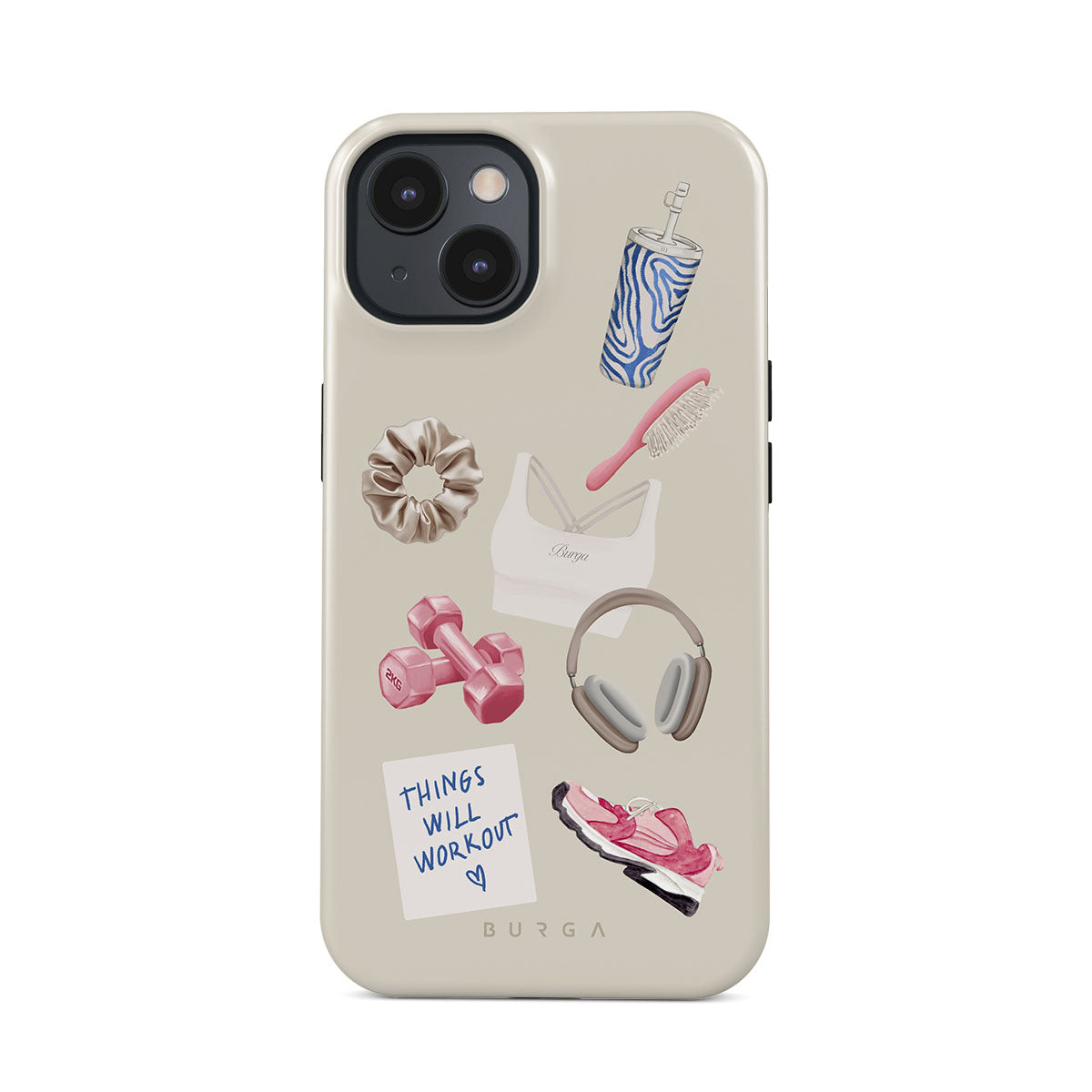 This design features: dumbbells, headphones, tumbler, hairbrush, pink trainers, sports bra, crunchie, "Things Will Work Out" sticky note