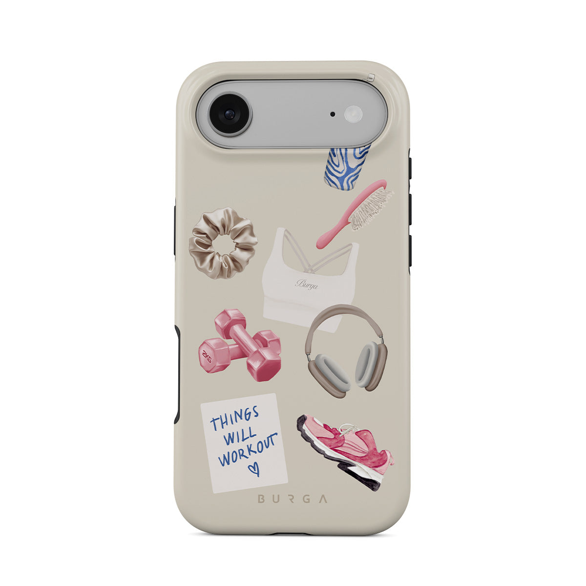 This design features: dumbbells, headphones, tumbler, hairbrush, pink trainers, sports bra, crunchie, "Things Will Work Out" sticky note