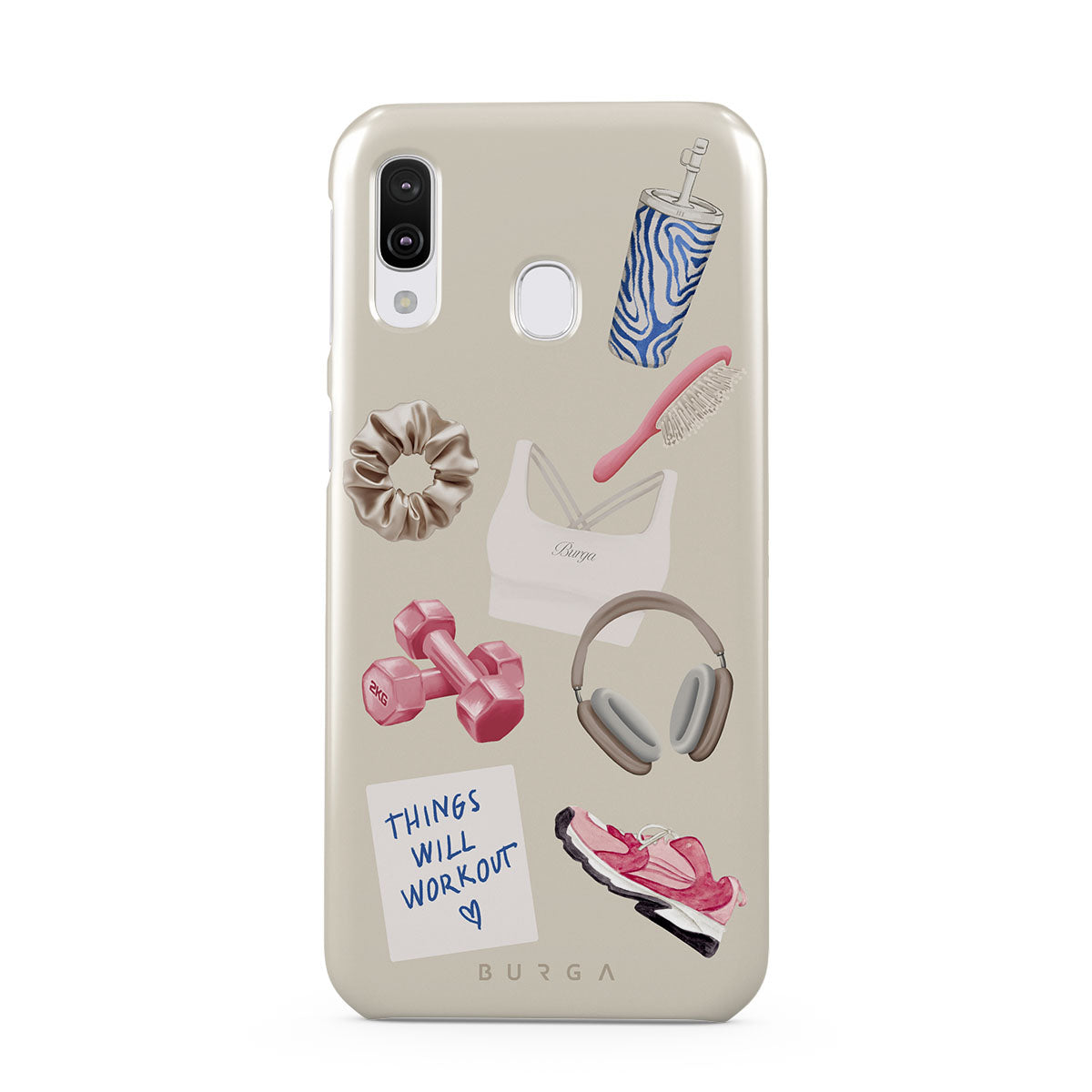 This design features: dumbbells, headphones, tumbler, hairbrush, pink trainers, sports bra, crunchie, "Things Will Work Out" sticky note