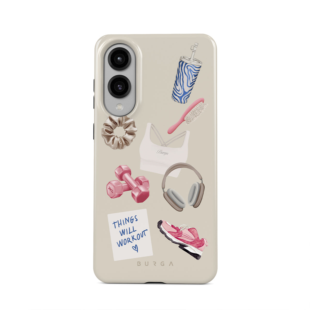 This design features: dumbbells, headphones, tumbler, hairbrush, pink trainers, sports bra, crunchie, "Things Will Work Out" sticky note