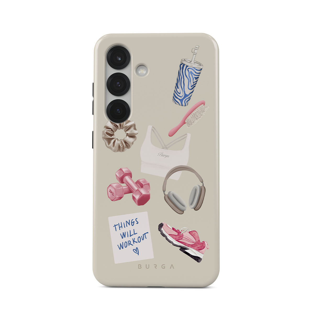This design features: dumbbells, headphones, tumbler, hairbrush, pink trainers, sports bra, crunchie, "Things Will Work Out" sticky note