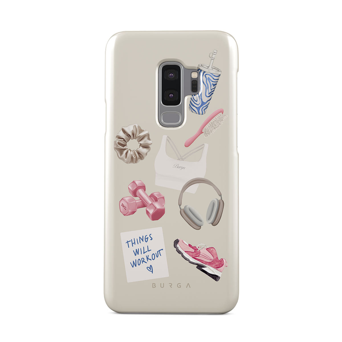 This design features: dumbbells, headphones, tumbler, hairbrush, pink trainers, sports bra, crunchie, "Things Will Work Out" sticky note