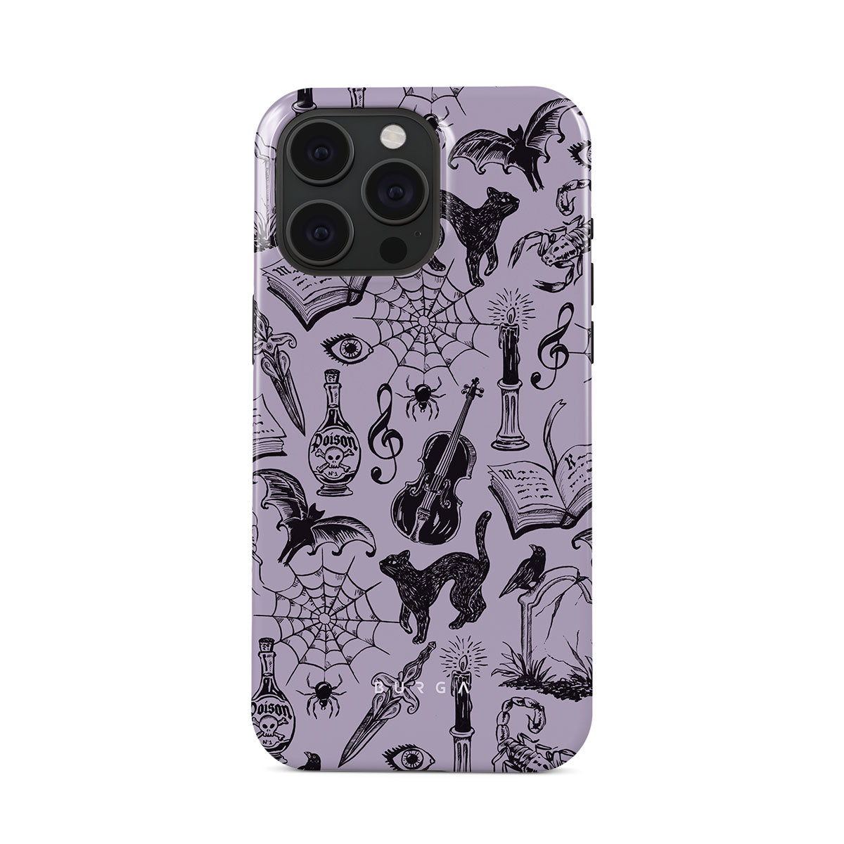 This design features: gothic doodles, mystical elements, spiders, spiderweb, cat, violin, eye, candle, dagger, book, bat, crow, scorpion