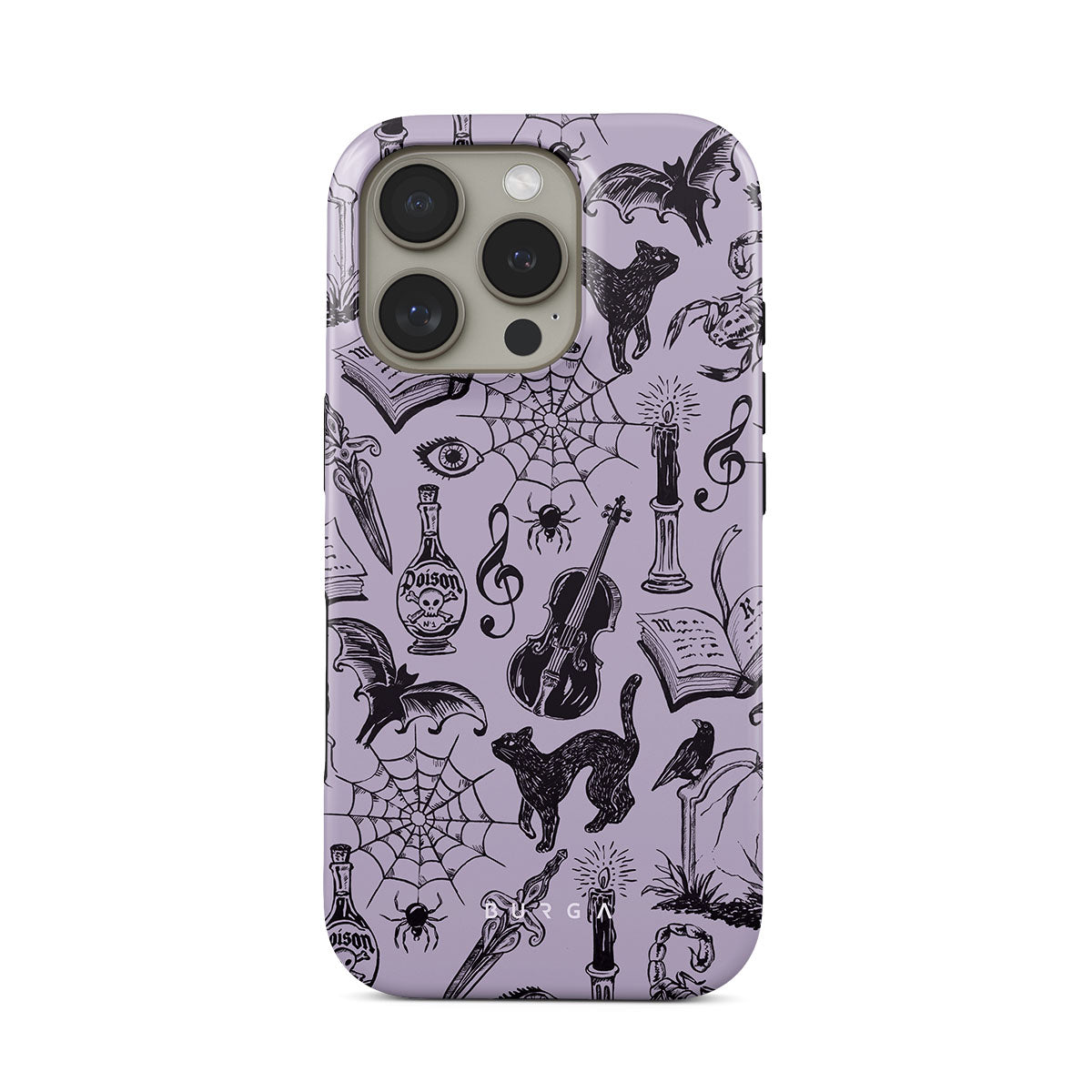 This design features: gothic doodles, mystical elements, spiders, spiderweb, cat, violin, eye, candle, dagger, book, bat, crow, scorpion