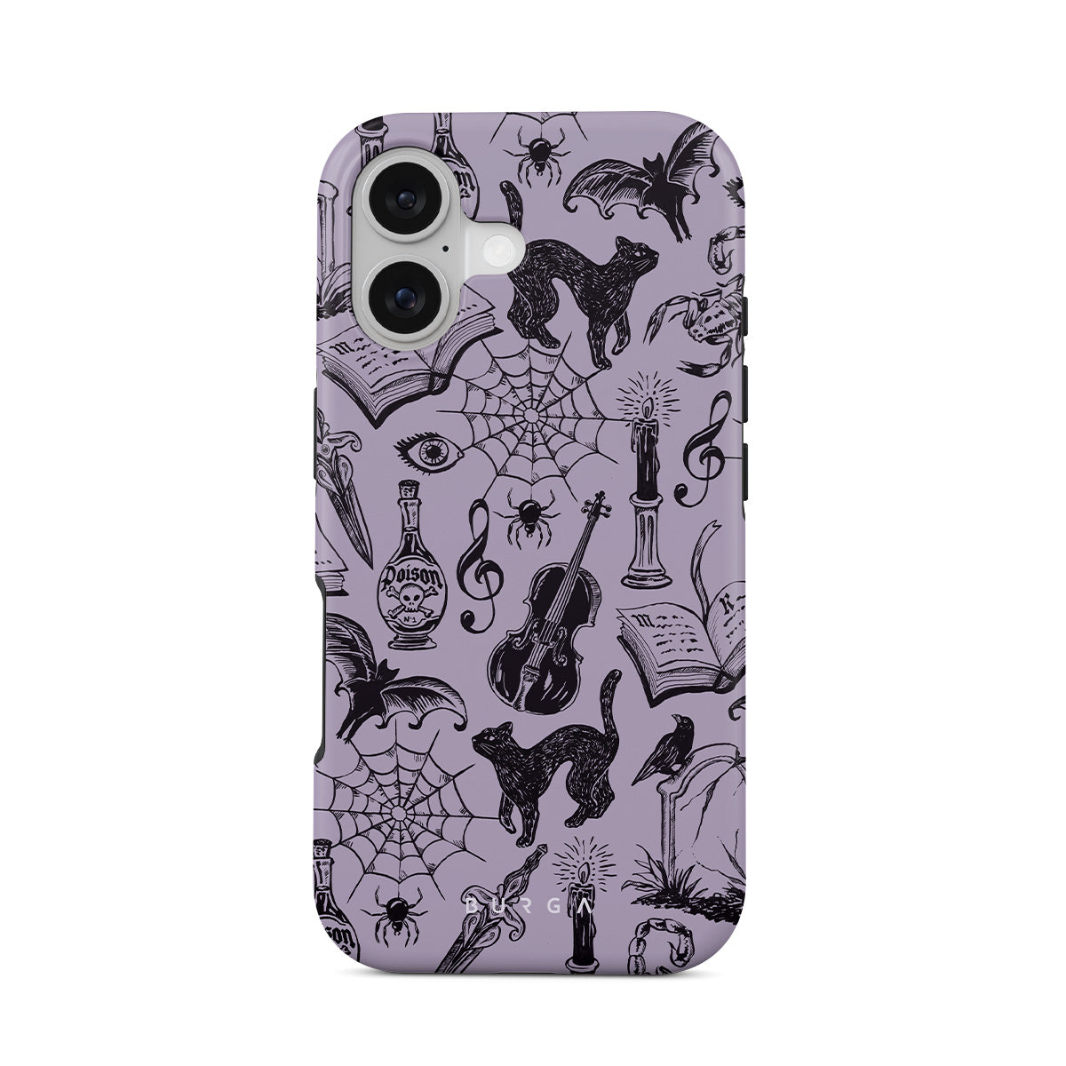 This design features: gothic doodles, mystical elements, spiders, spiderweb, cat, violin, eye, candle, dagger, book, bat, crow, scorpion