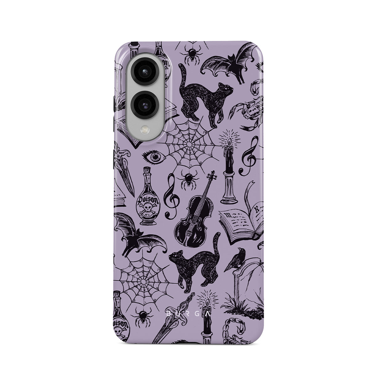 This design features: gothic doodles, mystical elements, spiders, spiderweb, cat, violin, eye, candle, dagger, book, bat, crow, scorpion