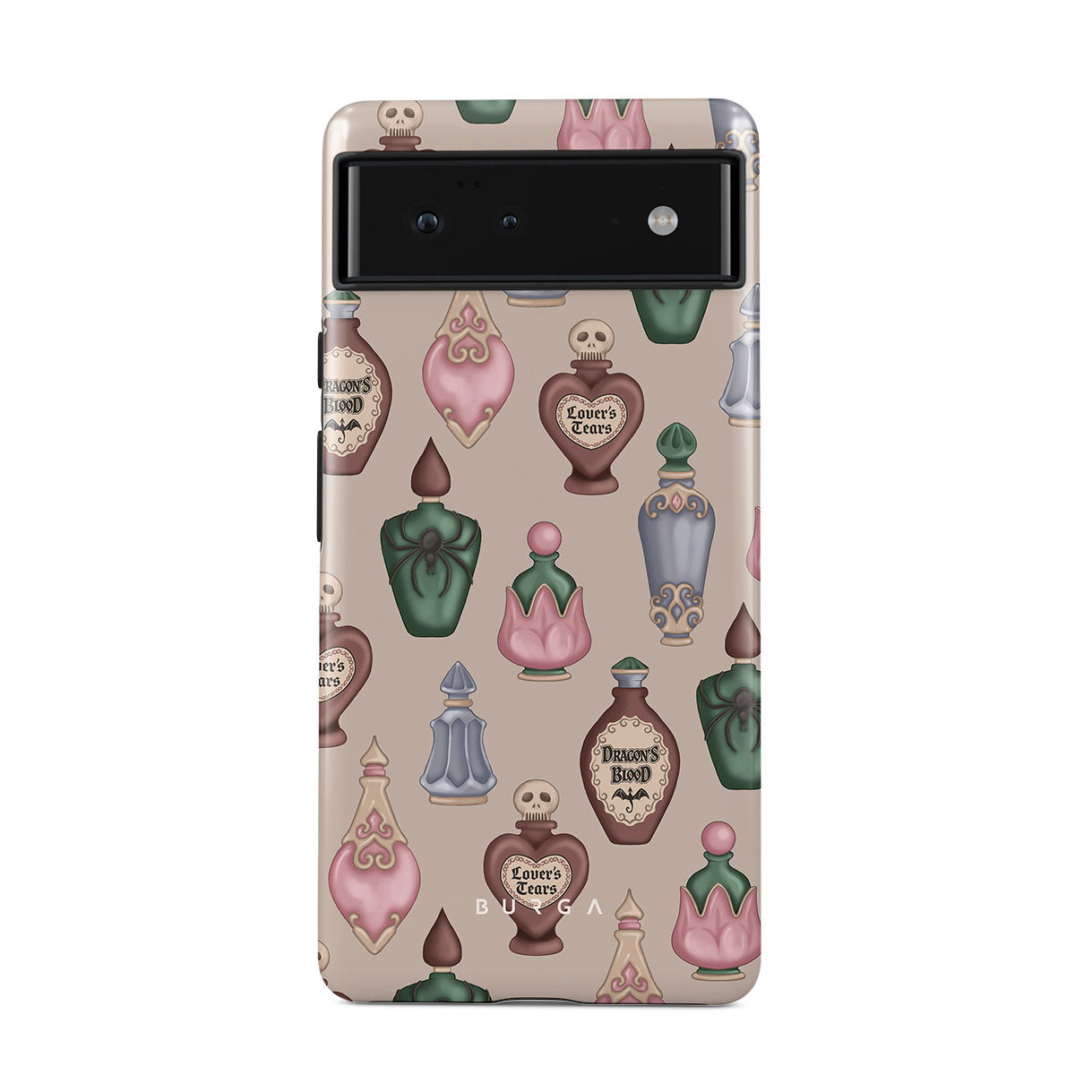 This design features: mystical potion bottles