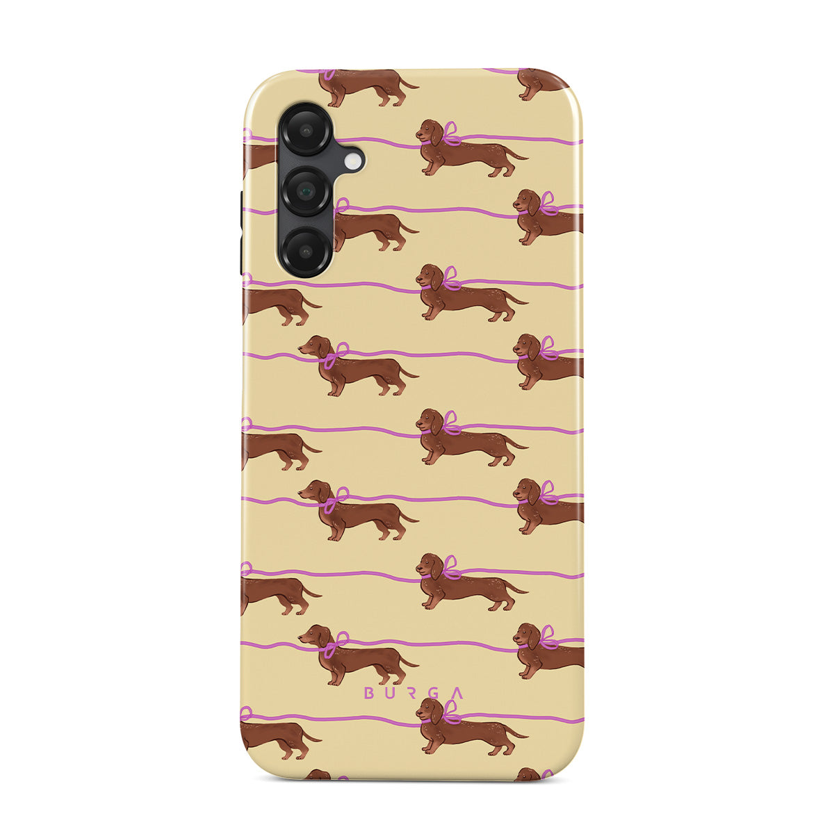 This Samsung Galaxy A14 5G phone case design doesn’t believe in time, only vibes. It features sassy sausage dogs with bows who, like you, are running 15 minutes behind—and blaming Mercury.
