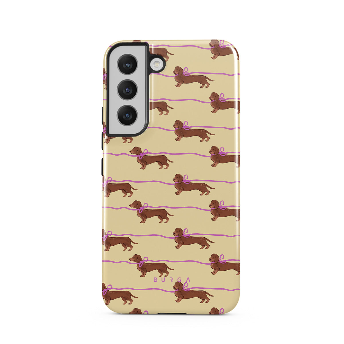 This Samsung Galaxy S22 Plus phone case design doesn’t believe in time, only vibes. It features sassy sausage dogs with bows who, like you, are running 15 minutes behind—and blaming Mercury.