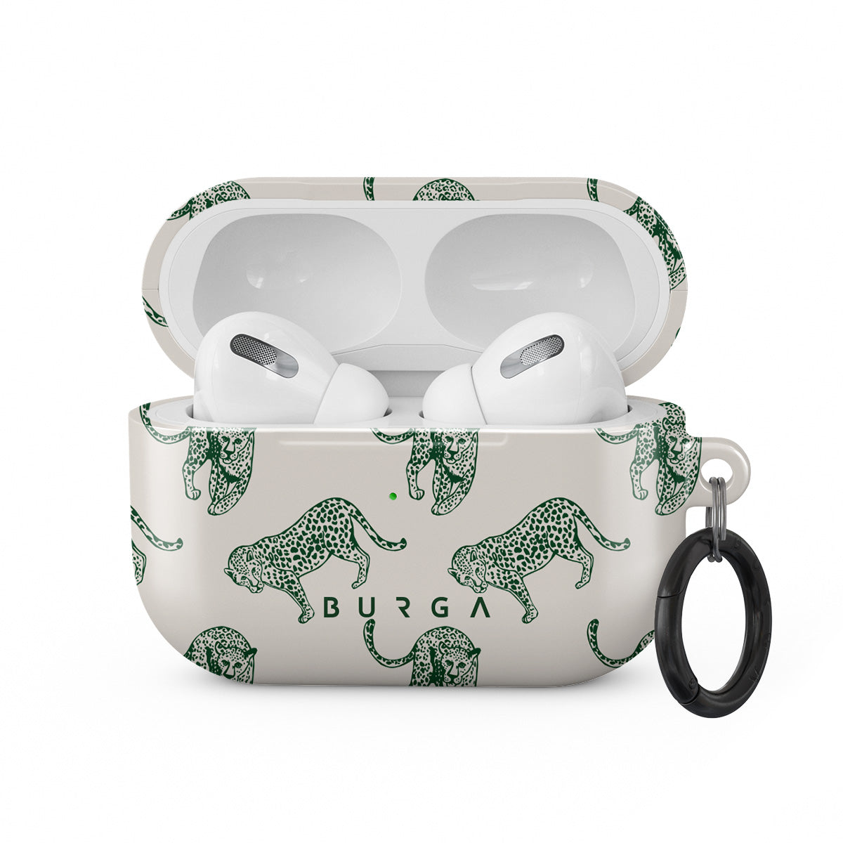 Our Antique Apple Airpods Pro case cover designa nude canvas kissed by refined green contours, painting an eternal saga of elegance. Enthroned at its center is a regal leopard embraced by a tender floral caress. A nod to timeless opulence, this design captures the essence of vintage prestige.