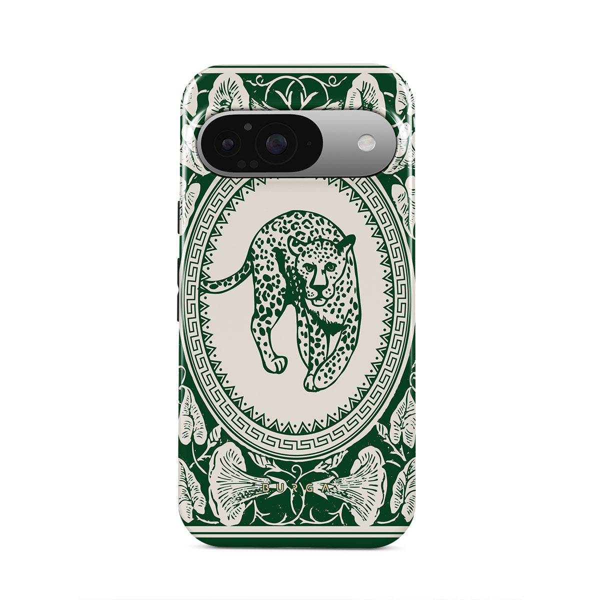 Our Antique Google Pixel 9 phone case design—a nude canvas kissed by refined green contours, painting an eternal saga of elegance. Enthroned at its center is a regal leopard embraced by a tender floral caress. A nod to timeless opulence, this design captures the essence of vintage prestige.