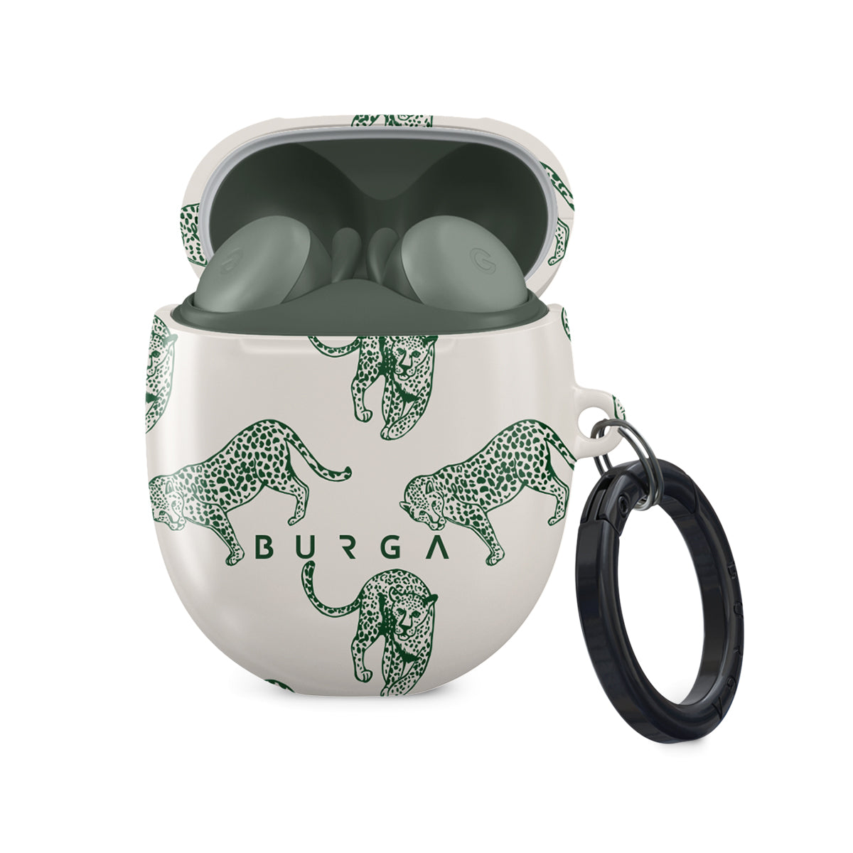 Our Antique Google Pixel Buds A case cover designa nude canvas kissed by refined green contours, painting an eternal saga of elegance. Enthroned at its center is a regal leopard embraced by a tender floral caress. A nod to timeless opulence, this design captures the essence of vintage prestige.