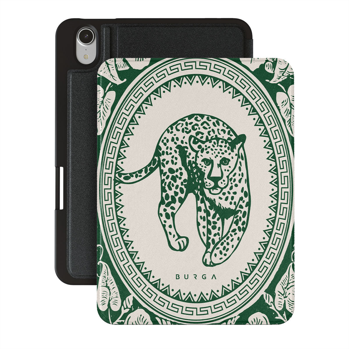 Our Antique iPad Mini 8.3 (A17 Pro/6th Gen) 2021 folio case designa nude canvas kissed by refined green contours, painting an eternal saga of elegance. Enthroned at its center is a regal leopard embraced by a tender floral caress. A nod to timeless opulence, this design captures the essence of vintage prestige.