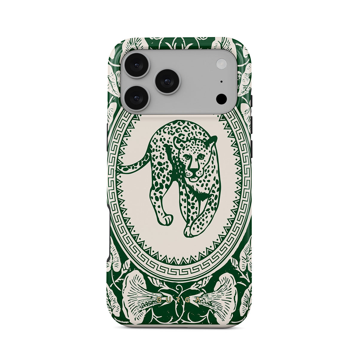 Our Antique iPhone 17 Pro Max phone case design—a nude canvas kissed by refined green contours, painting an eternal saga of elegance. Enthroned at its center is a regal leopard embraced by a tender floral caress. A nod to timeless opulence, this design captures the essence of vintage prestige.