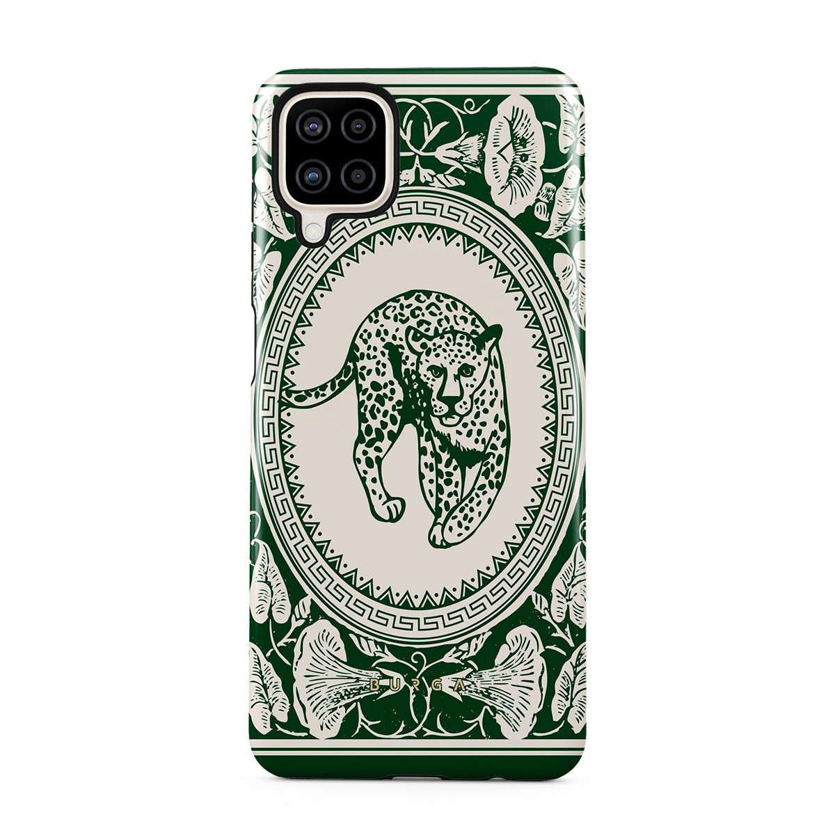 Our Antique Samsung Galaxy A12 4G phone case designa nude canvas kissed by refined green contours, painting an eternal saga of elegance. Enthroned at its center is a regal leopard embraced by a tender floral caress. A nod to timeless opulence, this design captures the essence of vintage prestige.