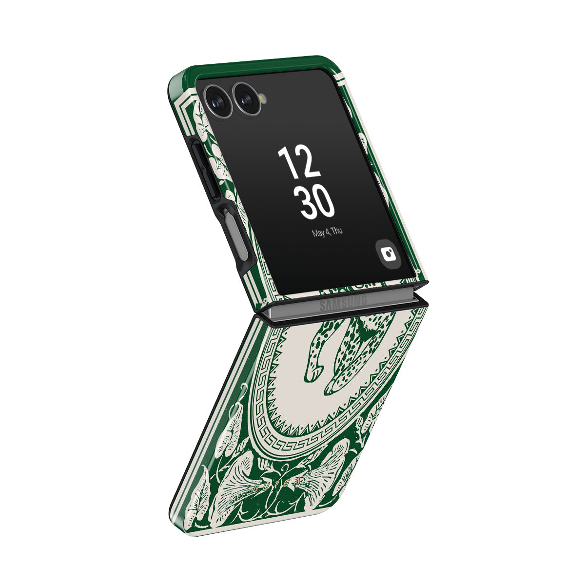 Our Antique Samsung Galaxy Z Flip 7 phone case design—a nude canvas kissed by refined green contours, painting an eternal saga of elegance. Enthroned at its center is a regal leopard embraced by a tender floral caress. A nod to timeless opulence, this design captures the essence of vintage prestige.