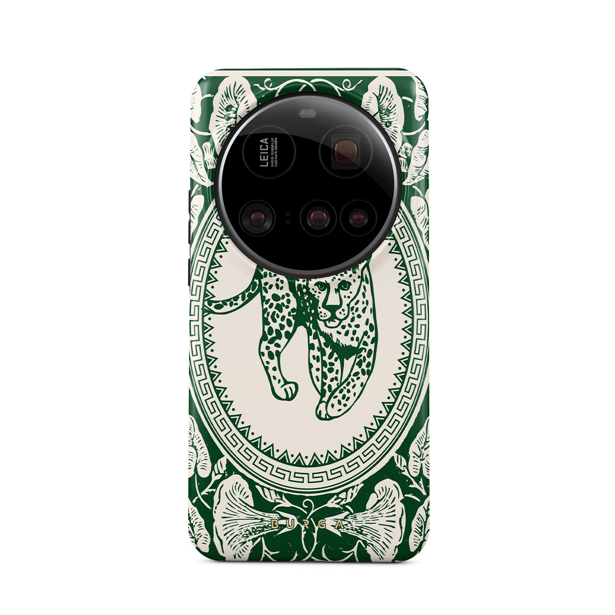 Our Antique Xiaomi 15 Ultra phone case design—a nude canvas kissed by refined green contours, painting an eternal saga of elegance. Enthroned at its center is a regal leopard embraced by a tender floral caress. A nod to timeless opulence, this design captures the essence of vintage prestige.