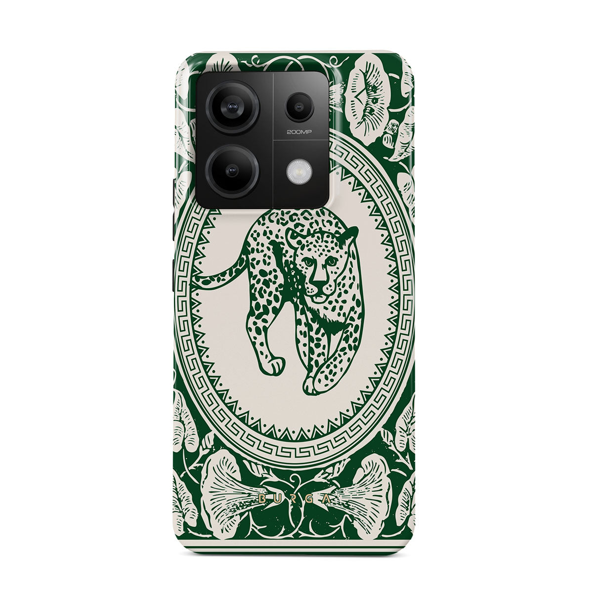 Our Antique Xiaomi Redmi Note 13 Pro 5G phone case design—a nude canvas kissed by refined green contours, painting an eternal saga of elegance. Enthroned at its center is a regal leopard embraced by a tender floral caress. A nod to timeless opulence, this design captures the essence of vintage prestige.