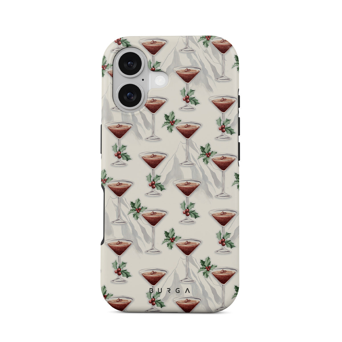 This design features: cocktail glasses, martinis, holly leaves