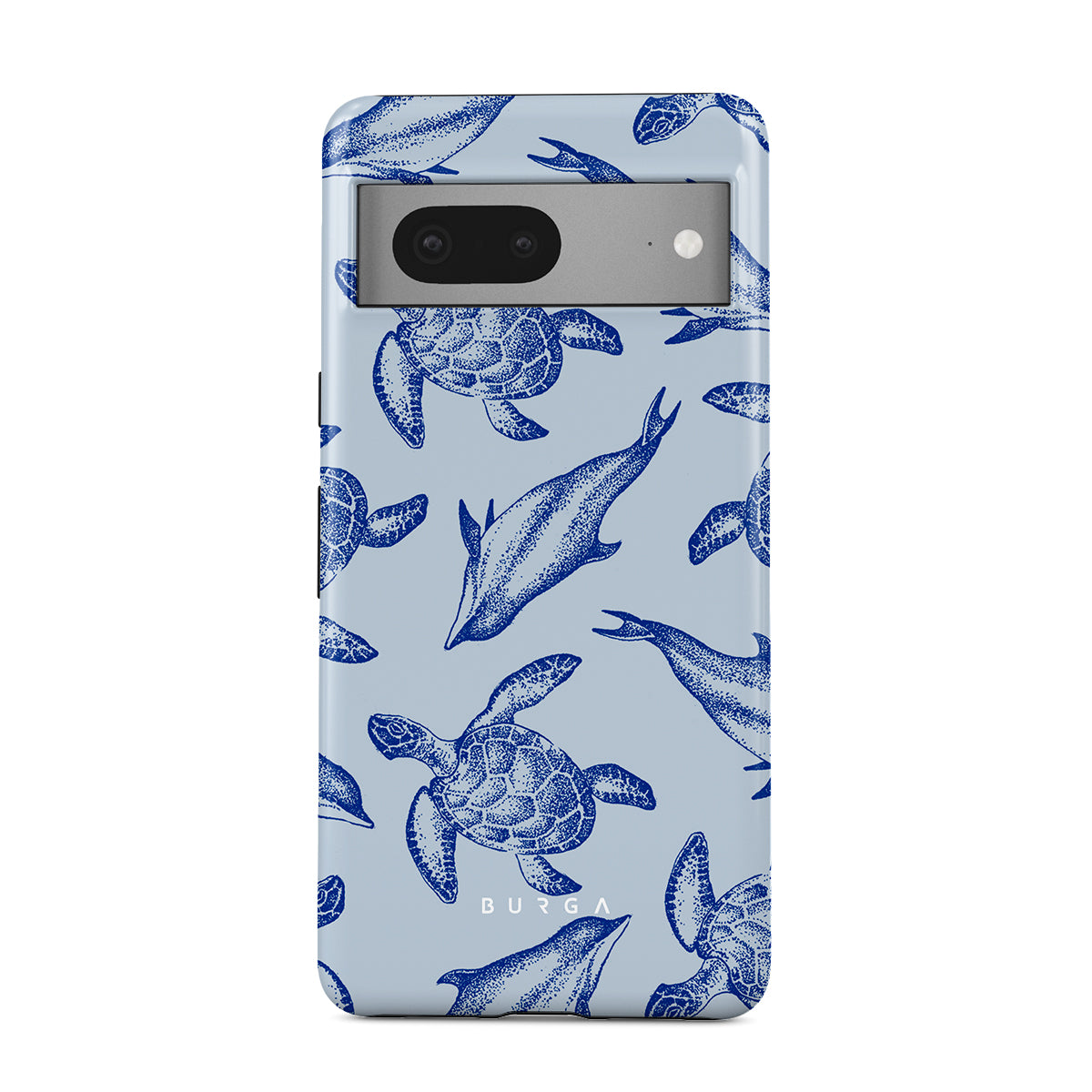 A beautiful design featuring lively turtles and dolphins playfully dancing in serene light blue water. Dive into the ocean's rhythm with our Aquatic Dance Google Pixel 7a case.