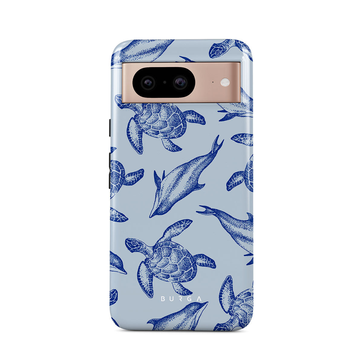 A beautiful design featuring lively turtles and dolphins playfully dancing in serene light blue water. Dive into the ocean's rhythm with our Aquatic Dance Google Pixel 8 case.