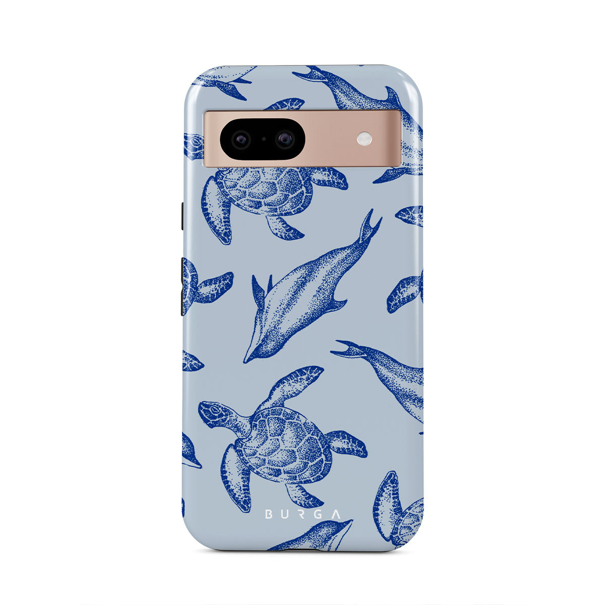 A beautiful design featuring lively turtles and dolphins playfully dancing in serene light blue water. Dive into the ocean's rhythm with our Aquatic Dance Google Pixel 8a case.
