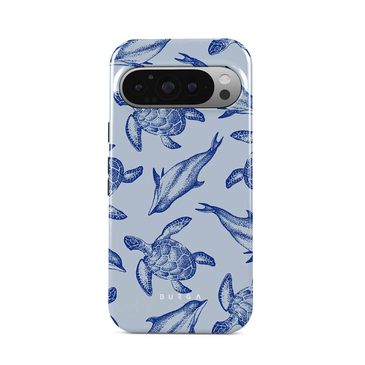 A beautiful design featuring lively turtles and dolphins playfully dancing in serene light blue water. Dive into the ocean's rhythm with our Aquatic Dance Google Pixel 9 Pro XL case.