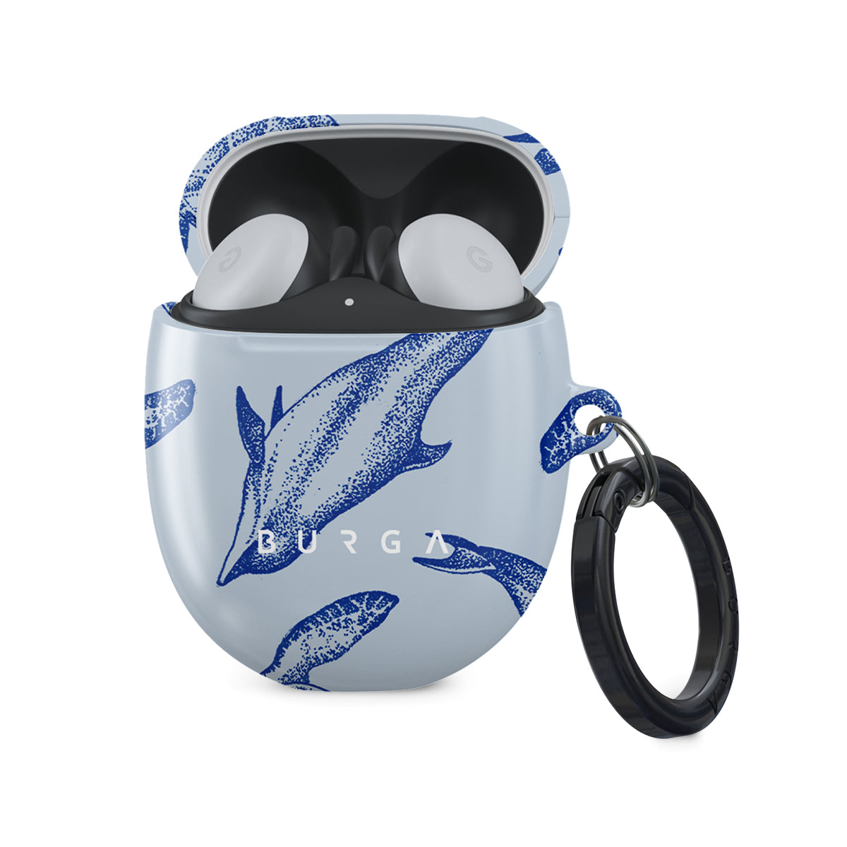 A beautiful design featuring lively turtles and dolphins playfully dancing in serene light blue water. Dive into the ocean's rhythm with our Aquatic Dance Google Pixel Buds 2 case cover.