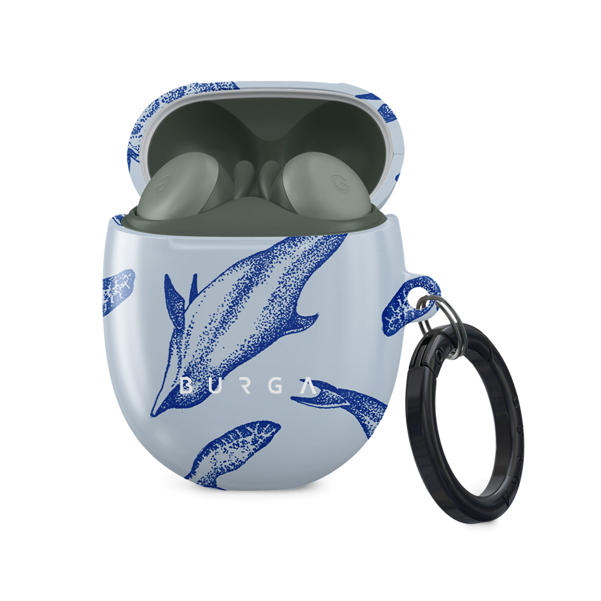 A beautiful design featuring lively turtles and dolphins playfully dancing in serene light blue water. Dive into the ocean's rhythm with our Aquatic Dance Google Pixel Buds A case cover.