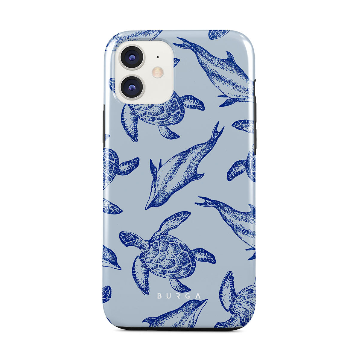 A beautiful design featuring lively turtles and dolphins playfully dancing in serene light blue water. Dive into the ocean's rhythm with our Aquatic Dance iPhone 11 case.