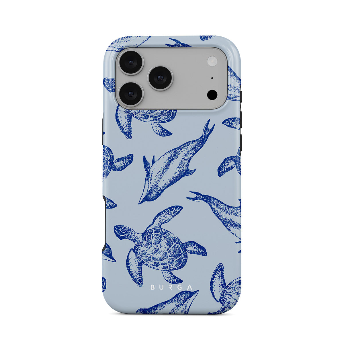 A beautiful design featuring lively turtles and dolphins playfully dancing in serene light blue water. Dive into the ocean's rhythm with our Aquatic Dance iPhone 17 Pro Max case.