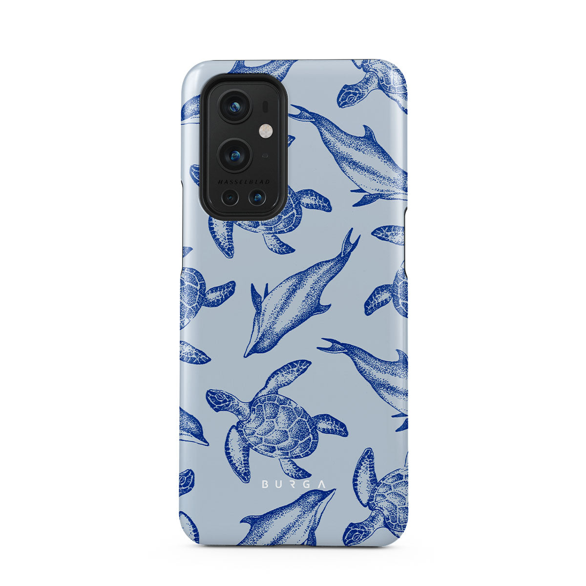 A beautiful design featuring lively turtles and dolphins playfully dancing in serene light blue water. Dive into the ocean's rhythm with our Aquatic Dance OnePlus 9 case.