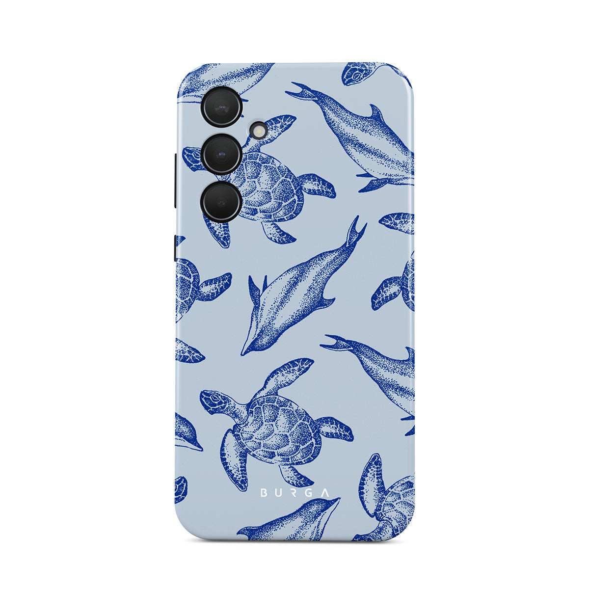 A beautiful design featuring lively turtles and dolphins playfully dancing in serene light blue water. Dive into the ocean's rhythm with our Aquatic Dance Samsung Galaxy A35 case.