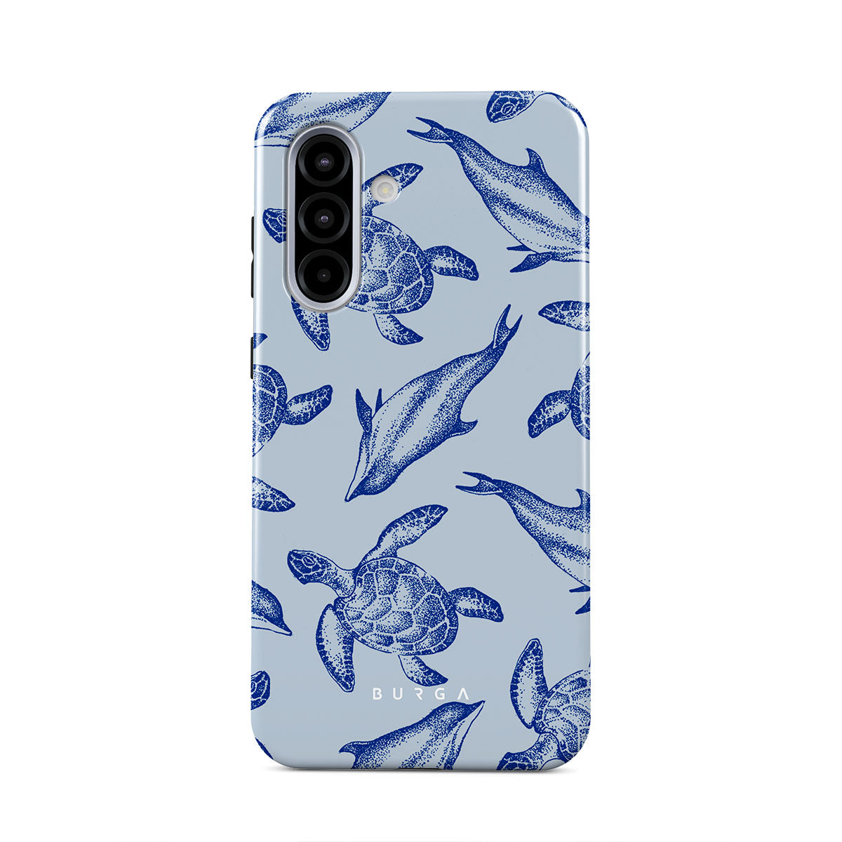 A beautiful design featuring lively turtles and dolphins playfully dancing in serene light blue water. Dive into the ocean's rhythm with our Aquatic Dance Samsung Galaxy A36 5G case.