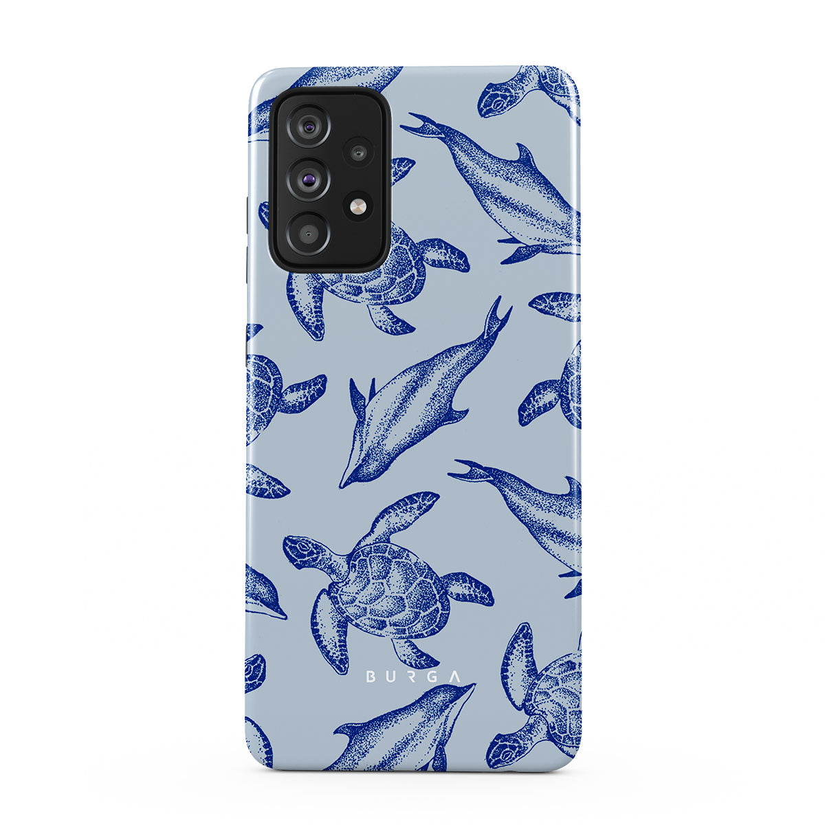 A beautiful design featuring lively turtles and dolphins playfully dancing in serene light blue water. Dive into the ocean's rhythm with our Aquatic Dance Samsung Galaxy A52 / A52S 4G / 5G case.