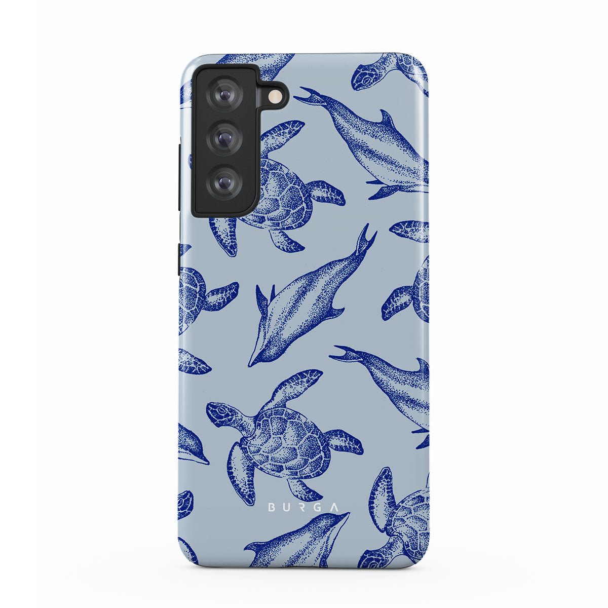 A beautiful design featuring lively turtles and dolphins playfully dancing in serene light blue water. Dive into the ocean's rhythm with our Aquatic Dance Samsung Galaxy S21 FE case.