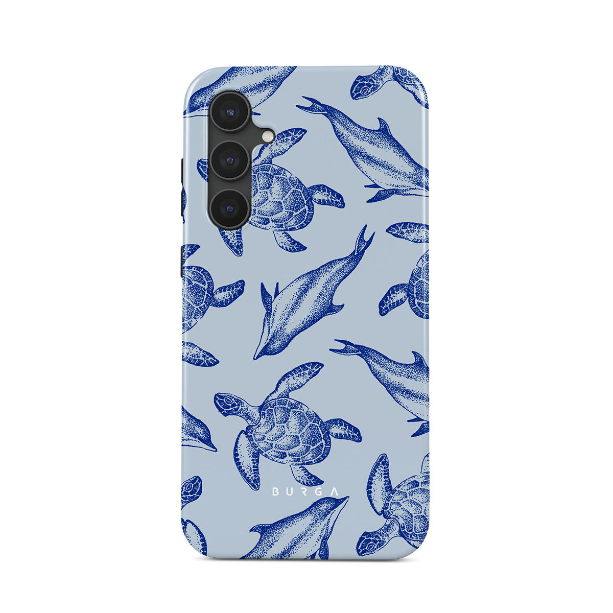 A beautiful design featuring lively turtles and dolphins playfully dancing in serene light blue water. Dive into the ocean's rhythm with our Aquatic Dance Samsung Galaxy S23 FE case.