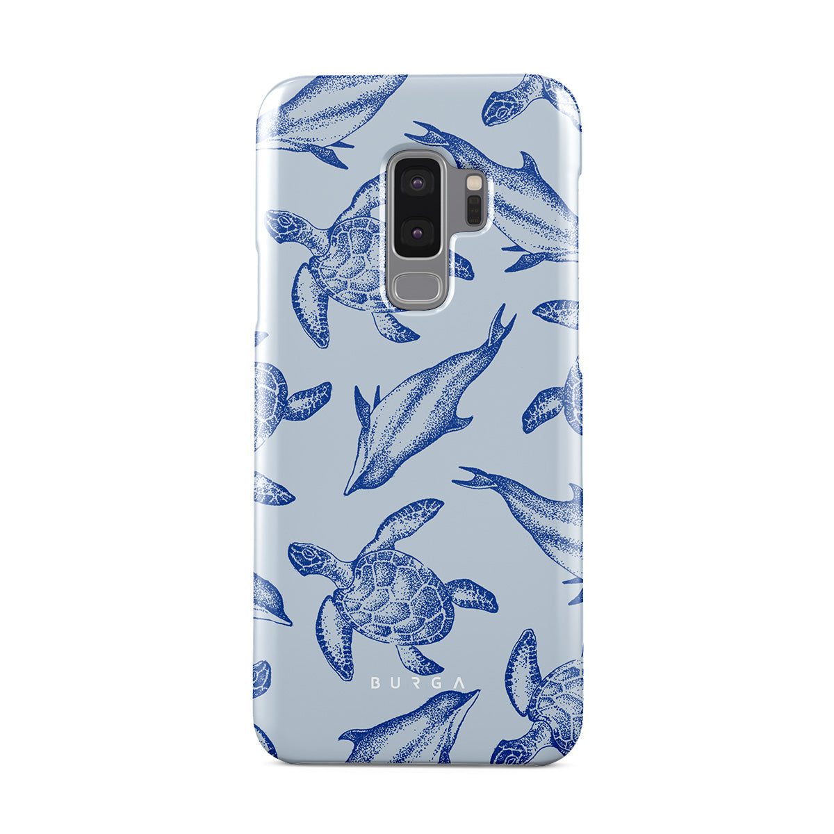 A beautiful design featuring lively turtles and dolphins playfully dancing in serene light blue water. Dive into the ocean's rhythm with our Aquatic Dance Samsung Galaxy S9 Plus case.
