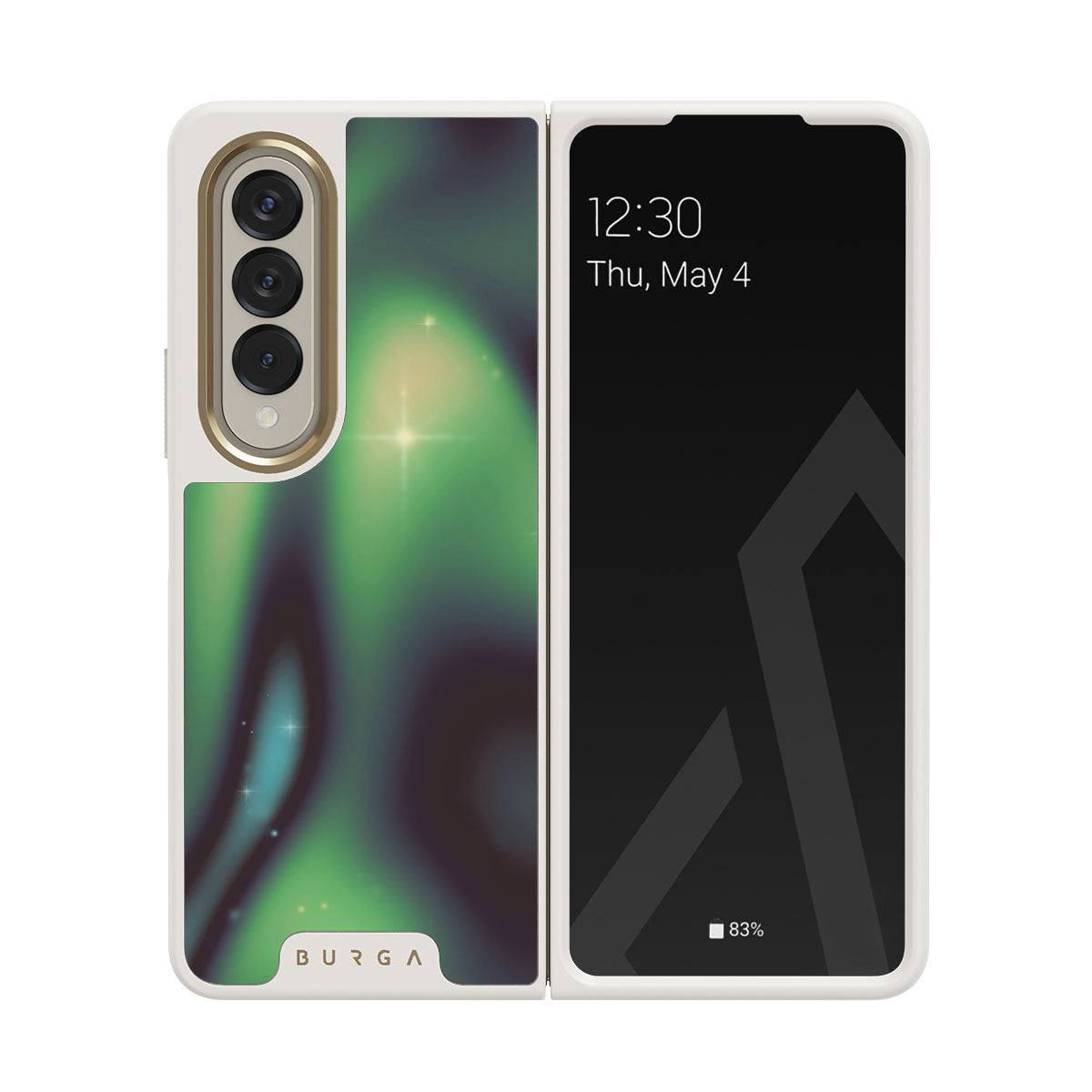 Nature's magic shines through in a mysterious display of lights. Delicate colors intertwine in a ballet of beauty and grace. Poetic harmony is captured with each swirl. It feels as if you're holding a piece of the night sky. Experience the serene grandeur of the Aurora Samsung Galaxy Z Fold 4 phone case design.
