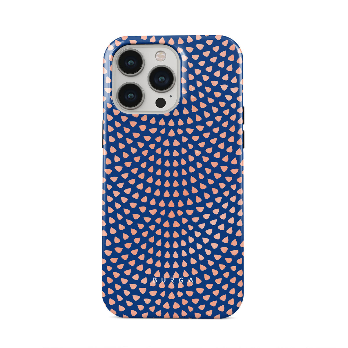 Rose gold teardrops meet a deep shade of blue in our Azure Waters iPhone 13 Pro Max phone case and create the duo worth taking with you every evening out. Add a touch of strictness with the symmetrical teardrops pattern paving the way and keeping your phone out of harm's way with the case that is as protective as it is beautiful.