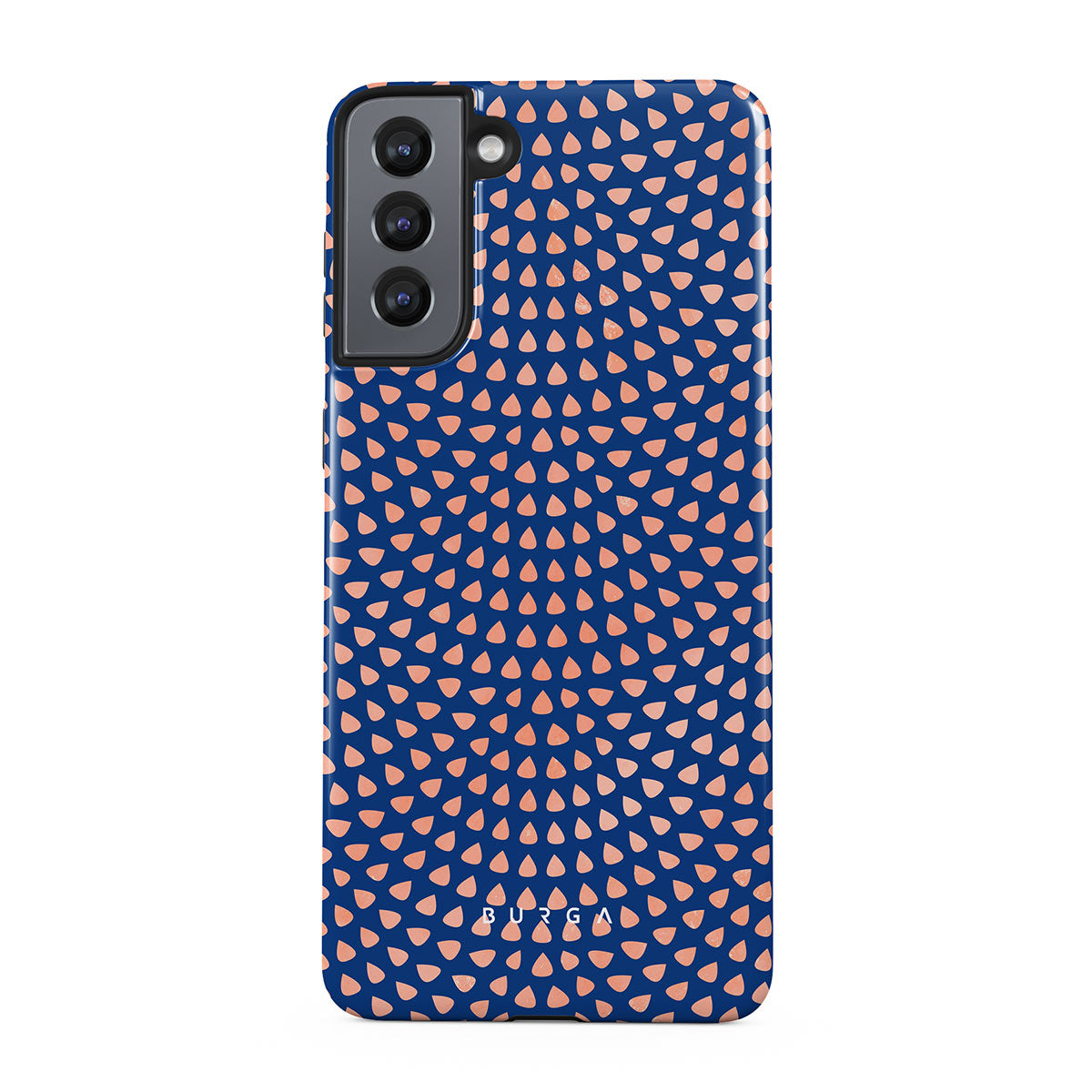 Rose gold teardrops meet a deep shade of blue in our Azure Waters Samsung Galaxy S21 phone case and create the duo worth taking with you every evening out. Add a touch of strictness with the symmetrical teardrops pattern paving the way and keeping your phone out of harm's way with the case that is as protective as it is beautiful.