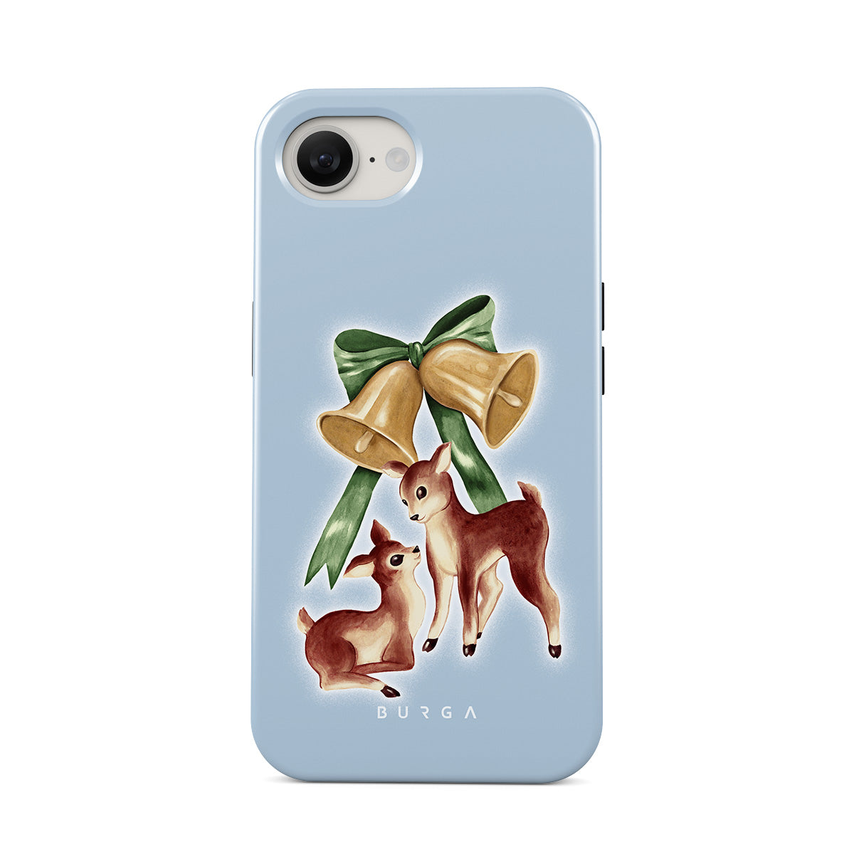 This design features: vintage reindeer, Christmas bells, golden bells, retro reindeer illustration, baby deer, light blue background