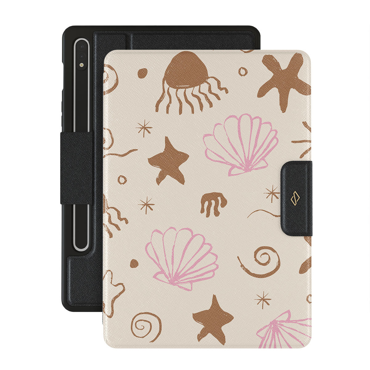 Our Beach Games Samsung Galaxy Tab S9 folio case features a delightful design inspired by seaside treasures, including cute starfish, pink seashells, and playful wave patterns on a sandy background. This beach-themed pattern captures the essence of a fun day at the shore, evoking the joy of discovering beautiful ocean gems.