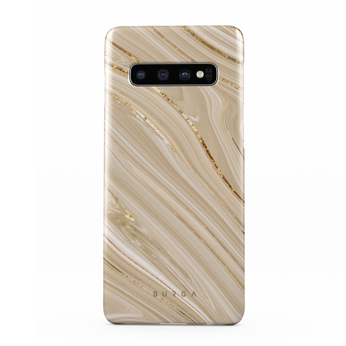 The Full Glam Samsung Galaxy S10 Plus phone case exudes elegance and softness in the beige color scheme with golden accents. The delicate design of the phone case will enhance your style and keep your phone safe and sound while doing that.