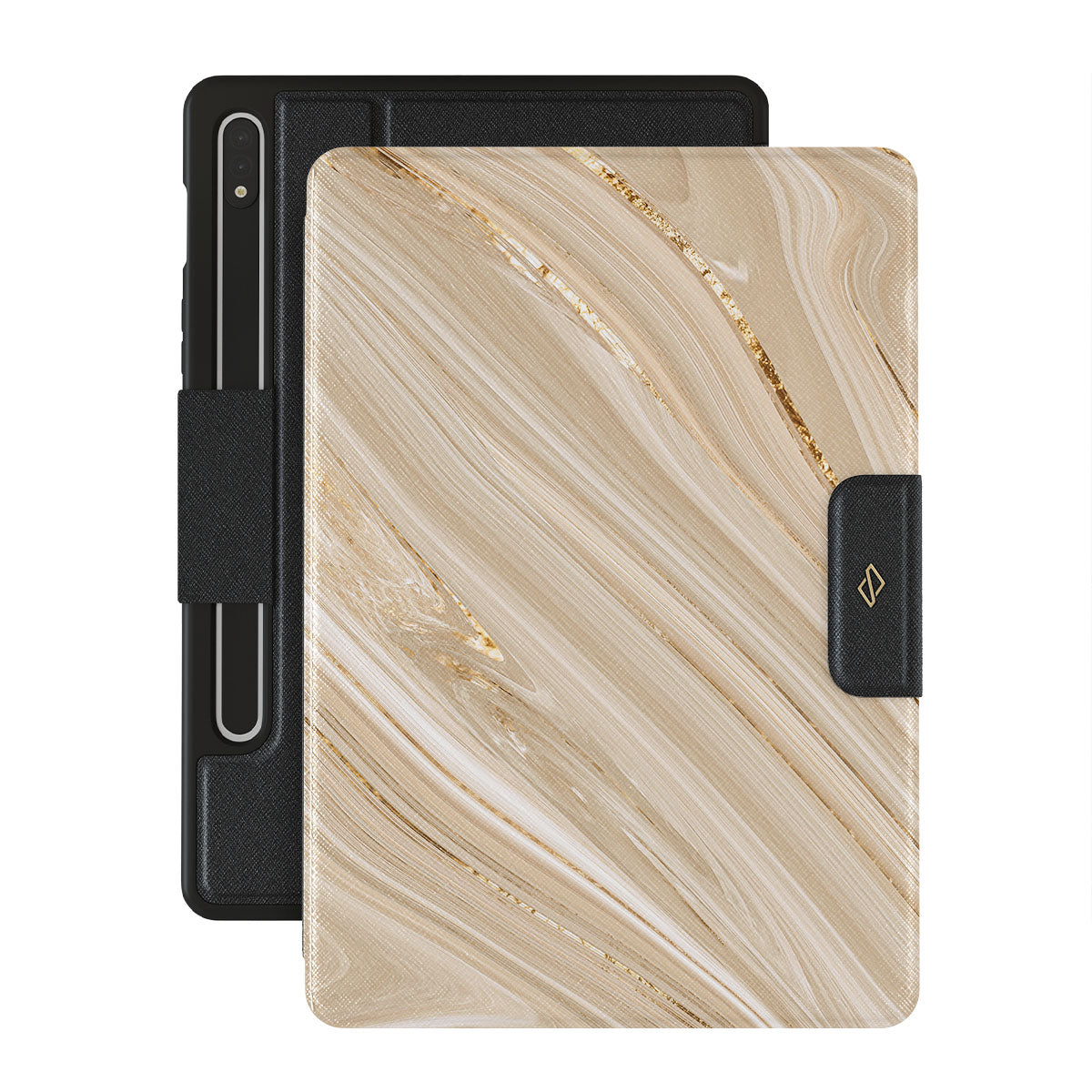 The Full Glam Samsung Galaxy Tab S8+/S7+/S7 FE folio case exudes elegance and softness in the beige color scheme with golden accents. The delicate design of the phone case will enhance your style and keep your phone safe and sound while doing that.