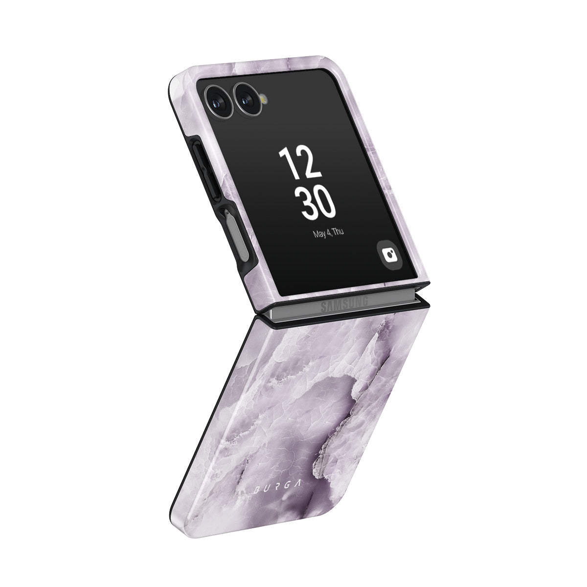 The gray violet-colored Black Currant Samsung Galaxy Z Flip 7 phone case showcases a soft marble design that will add a touch of luxury to your style. The color itself represents the future and dreams, yet the nature of it offers a calming effect. Keep a piece of serenity in your hands.