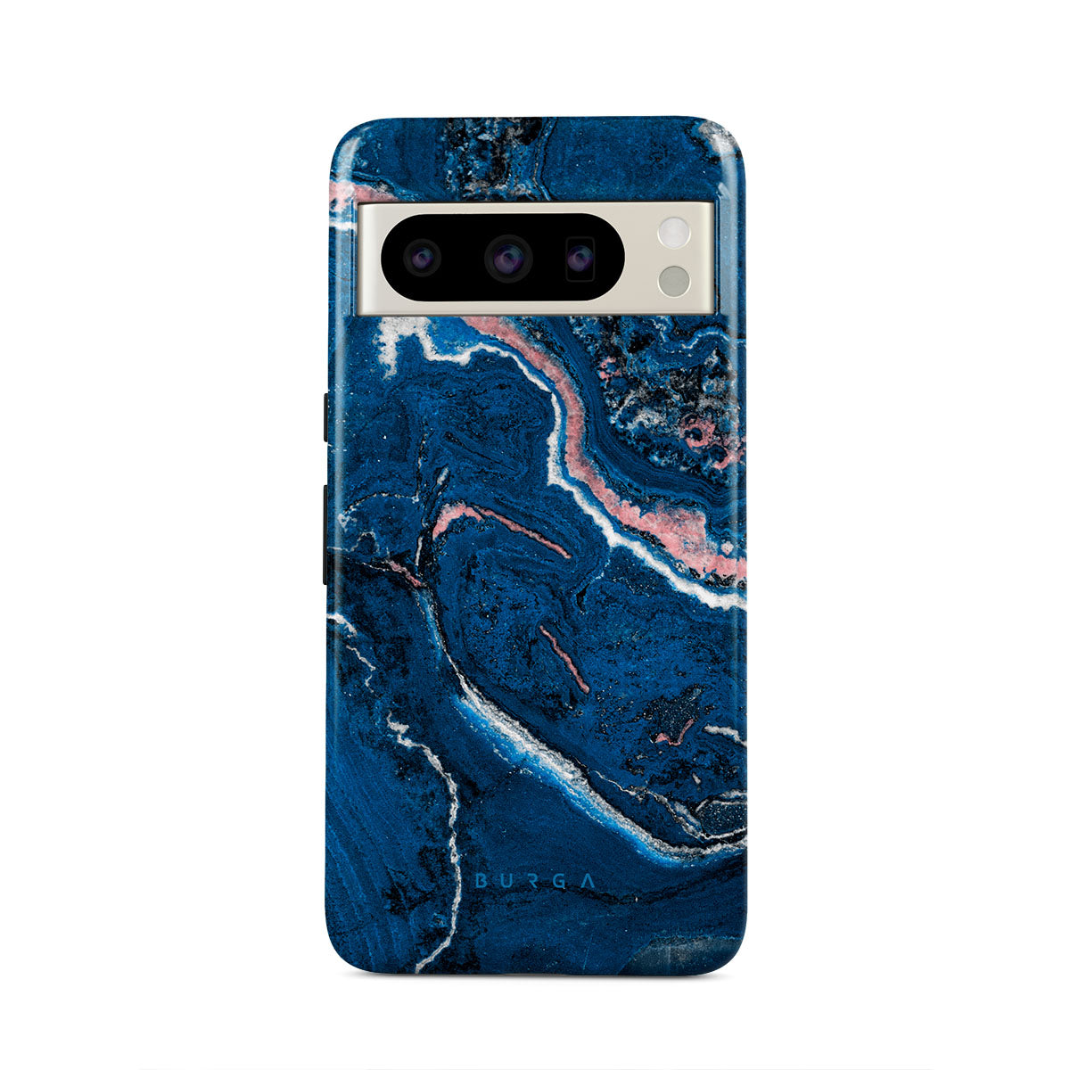 Electric indigo blue meets white, and pastel pink swirls in a unique marble pattern in our Blue Lagoon Google Pixel 8 Pro phone case. The modern take on a blue marble trend will look aesthetically pleasing on your device while offering durable protection from any falls.