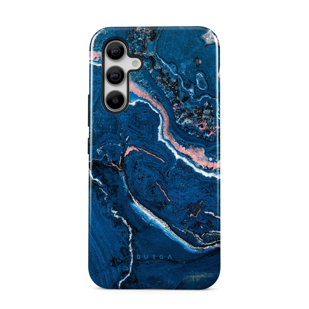 Electric indigo blue meets white, and pastel pink swirls in a unique marble pattern in our Blue Lagoon Samsung Galaxy A55 phone case. The modern take on a blue marble trend will look aesthetically pleasing on your device while offering durable protection from any falls.