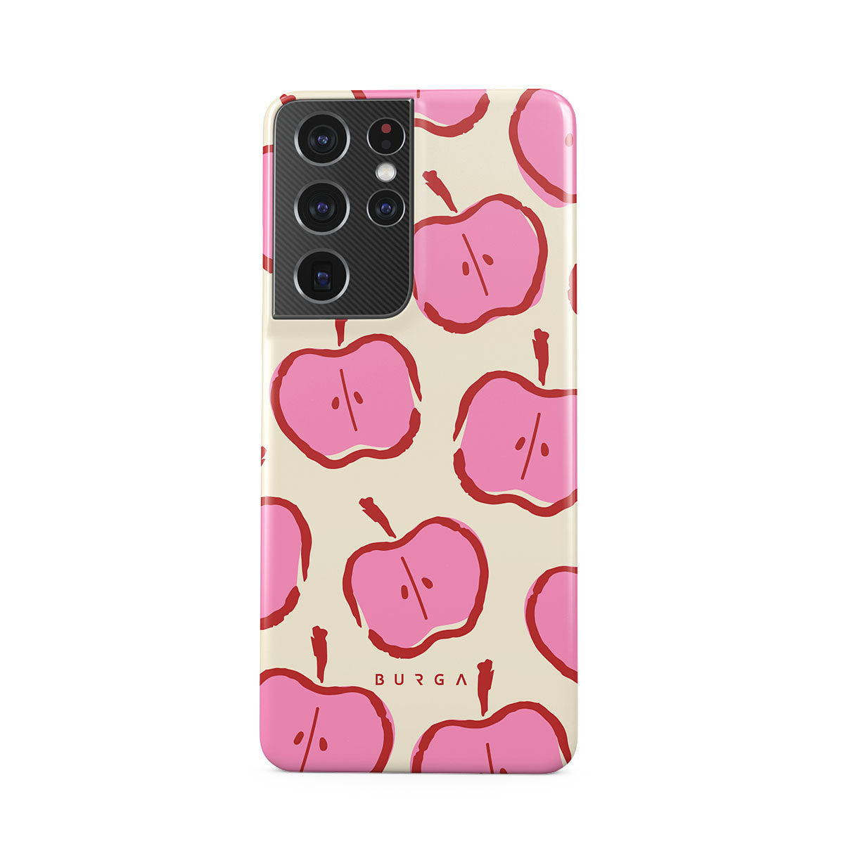 Our Bon Appétit Samsung Galaxy S21 Ultra phone case design makes every day feel like a magical adventure filled with sweet surprises. The playful pink hues of the apples stand out brilliantly against the serene cream background, creating a captivating and enchanting visual.